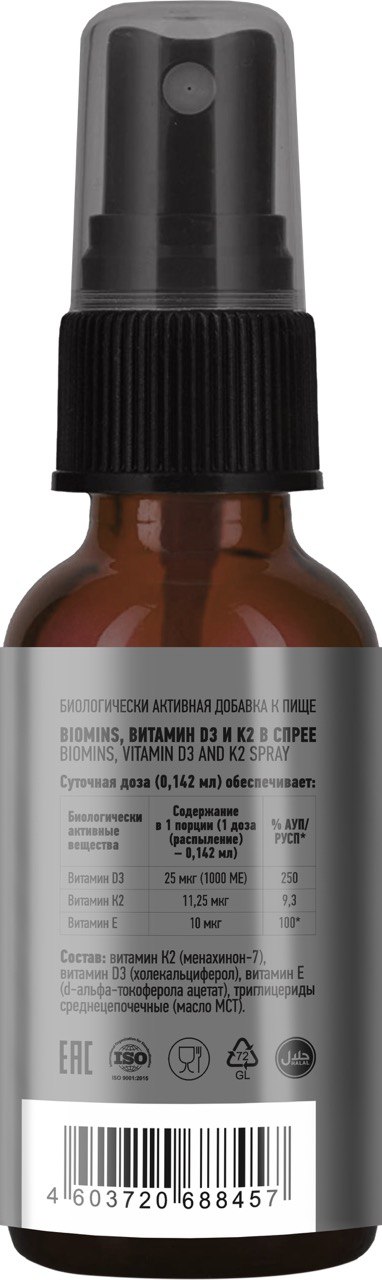 Состав: Витамин К2 (менахинон-7), витамин Д3 (холекальциферол), витамин Е (d-альфа-токоферола ацетат, триглицериды среднецепочечные (масло МСТ), масло оливковое.